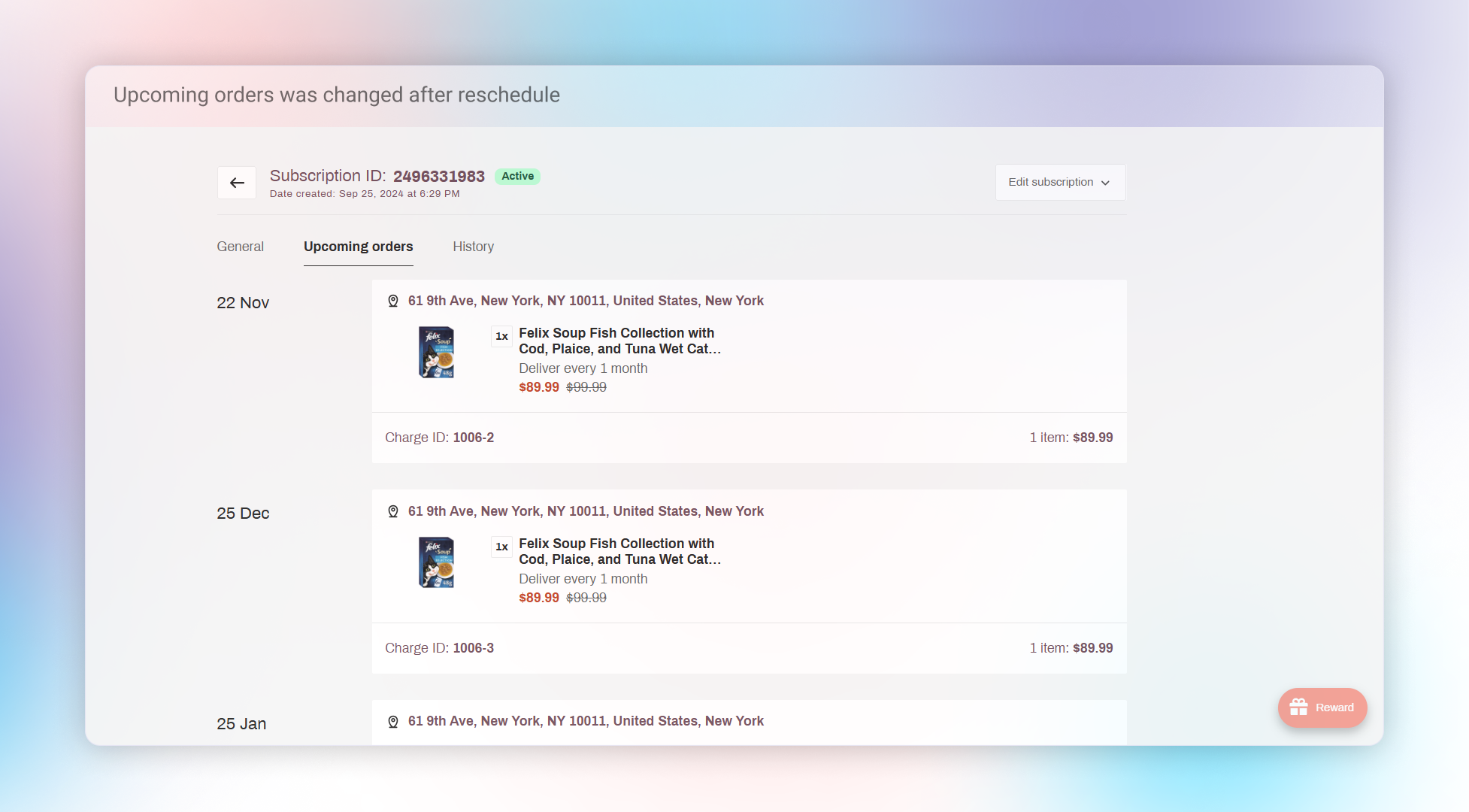 This new feature allows customers to modify the delivery date for their next subscription cycle. For example, if you’re subscribed to monthly cat food deliveries set to arrive on the 25th of each month, you can reschedule to receive your delivery earlier, such as on the 22nd, when needed.