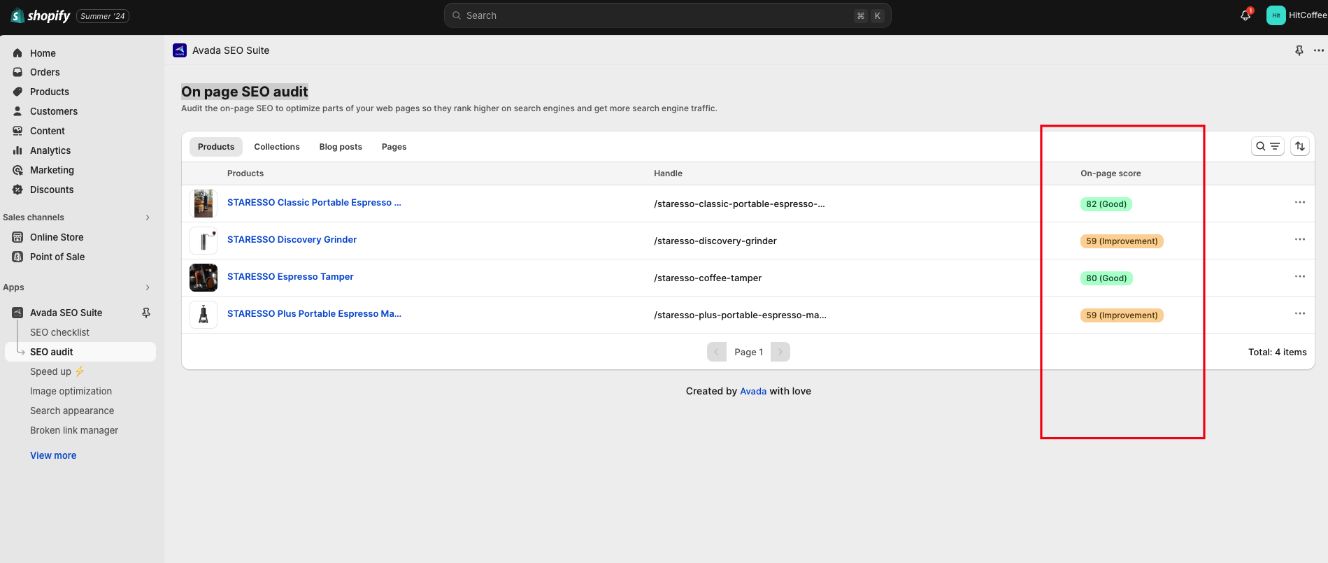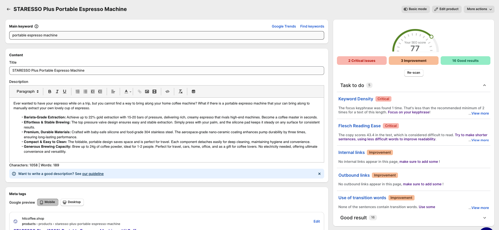 Another option is to the `SEO audit` menu on the left, to visit the `On page SEO audit` page and look for products with on-page SEO scores that need improvements. In this example, we will try to improve the SEO score for the product `STARESSO Plus Portable Espresso Machine`