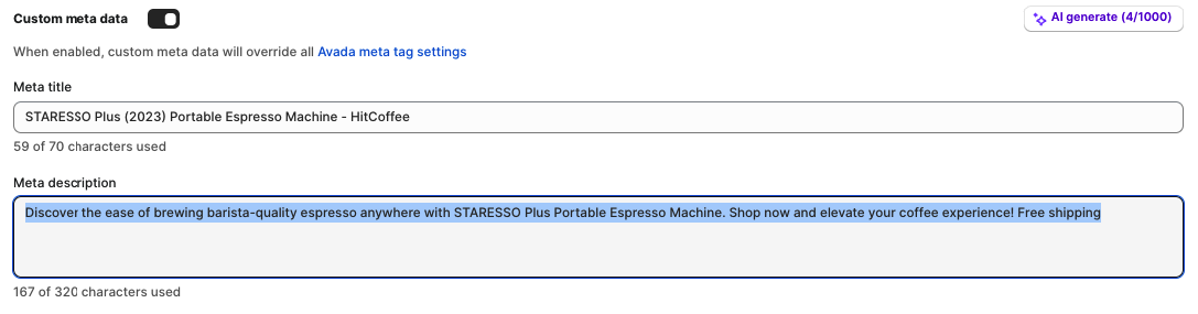 Let's go with custom metadata for this product over the basic meta tag rule option. It is recommended to use AI assistant in our app to generate the [meta title](https://docs.avada.io/seo-suite-help-center/knowledge-hub/tips-writing-your-meta-title) and description.
