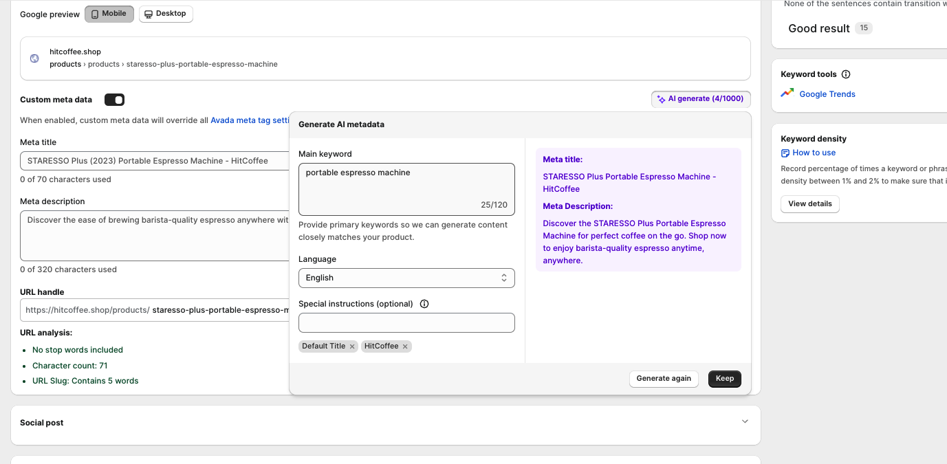 Our app acts as a sidekick, helping you enhance the SEO of your product listings without relying on automatic content generation. We believe in giving you control over this process because: