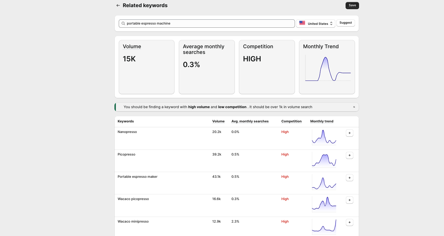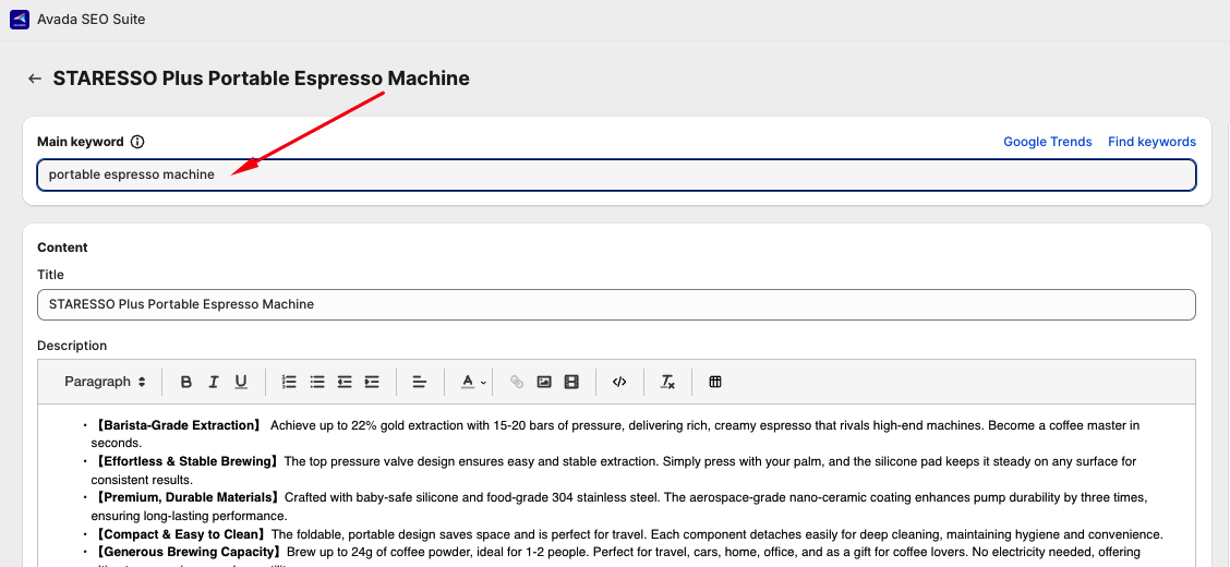 In this product, after doing some research, we came up with setting the main keyword as `portable espresso machine` .&#x20;